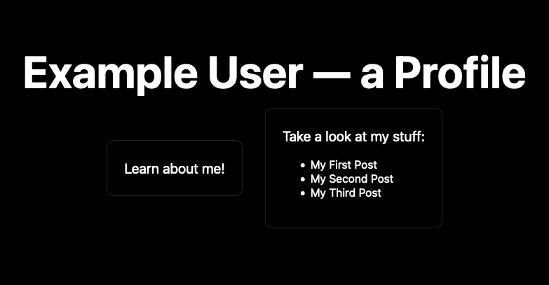 // [...] // Import the React modules for state variables and effects. import {useState, useEffect} from 'react' // Create the function for the home page. export default function Home({ postsInfo }) { // Initialize the state variable and its set function. const [postsData, setPostsData] = useState([]); // Have the page load post data from the API on page load. useEffect(() => { fetch('/api/posts') .then((res) => res.json()) .then((data) => setPostsData(data)) }, []) // [...] <div className={styles.grid}> <div className={styles.card}> <p>Learn <a href='/about'>about me</a>!</p> </div> <div className={styles.card}> <p>Take a look at my stuff:</p> <ul> {postsData.map((postData) => ( <li key={postData.slug}> <a href={ '/posts/' + postData.slug }>{postData.name}</a> </li> ))} </ul> </div> </div> // [...]